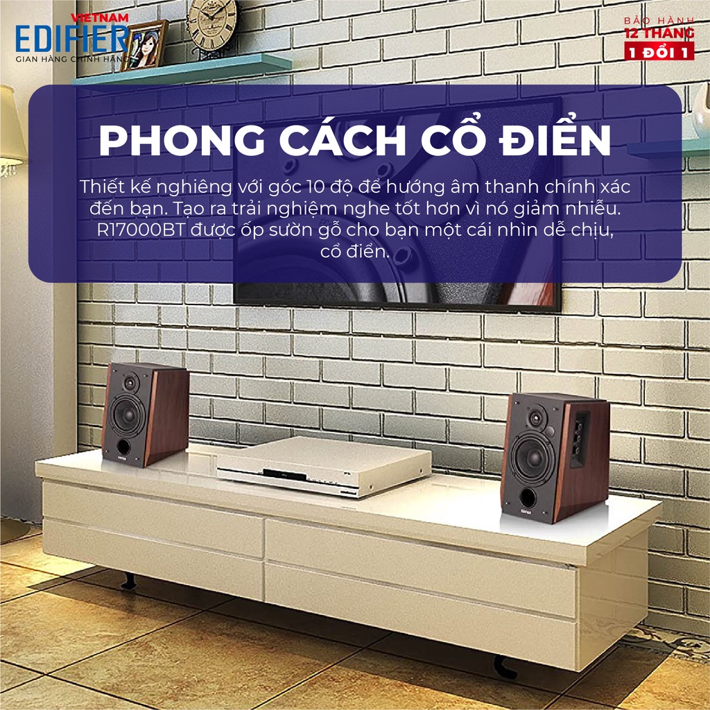 - Phong cách cổ điển: Thiết kế nghiêng với góc 10 độ để hướng âm thanh chính xác đến bạn. Tạo ra trải nghiệm nghe tốt hơn vì nó giảm nhiễu. R17000BT được ốp sườn gỗ cho bạn một cái nhìn dễ chịu, cổ điển.